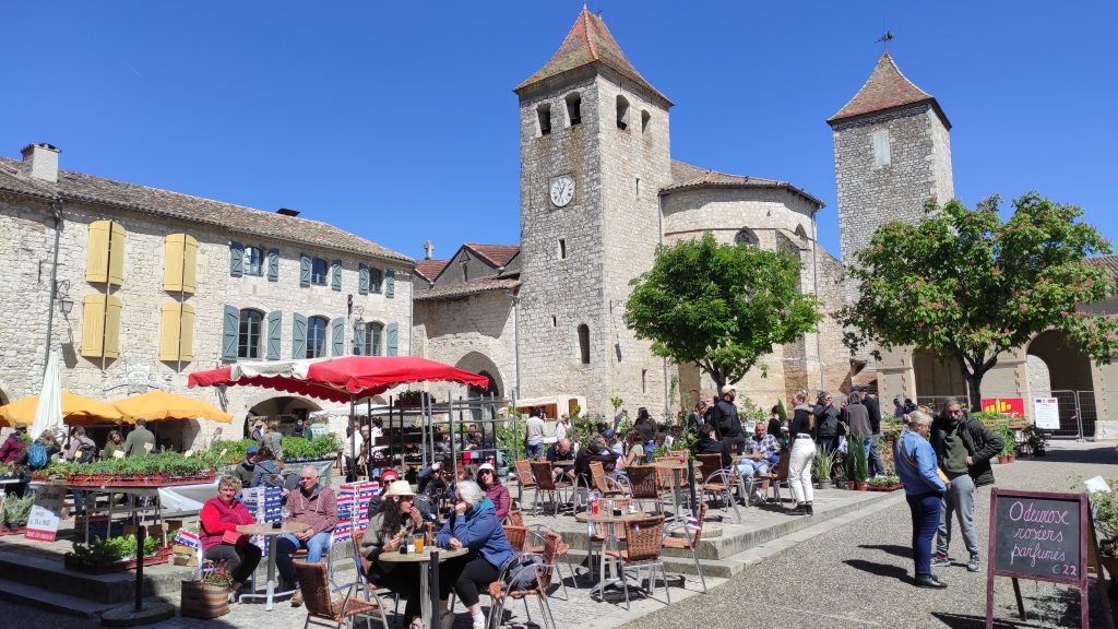 Nous prenons les petites routes à travers le Lot-et-Garonne pour rejoindre Lauzerte en passant par Beauville, Roquecor et Montaigu-de-Quercy. A Lauzerte, c’est le marché aux plantes et les restos de la place de la ville haute sont bondés.