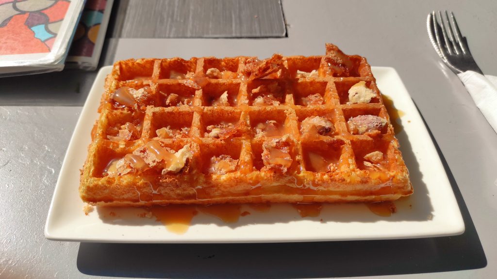 Arrivés en haut, nous prenons une pause méritée et reprenons « quelques » calories en nous régalant d’une gaufre à la cordaise, nappée de caramel au beurre salé et saupoudrée de morceaux de croquants aveyronnais aux noix. Trop bon !