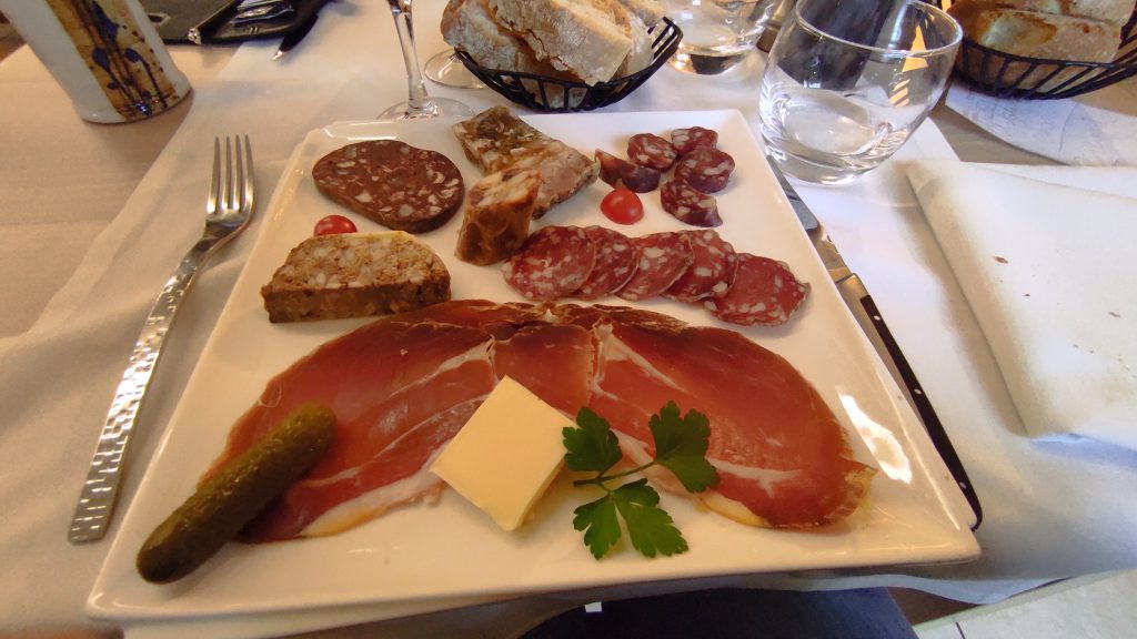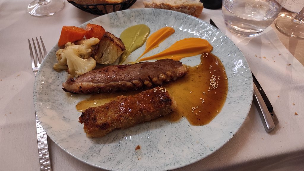 Après avoir fait un petit tour dans le village et nous être installés dans la chambre, nous nous attablons dans la jolie salle de restaurant qui est assez remplie pour un dimanche soir. Nous craquons sur le menu à 26€. Assiette autour du roquefort pour Isabelle, salade aux noix et morceaux de roquefort accompagnée d’une tarte aux poires, oignons, noix et roquefort et d’une crème glacée au roquefort qui était excellente ! Moins porté sur les moisissures, je choisis l’assiette de charcuterie aveyronnaise très copieuse. Nous continuons avec un magret au miel et sauce soja accompagné d’une croquette de canard confit ! Nous prenons des crèmes glacées en dessert pour faire couler tout ça.