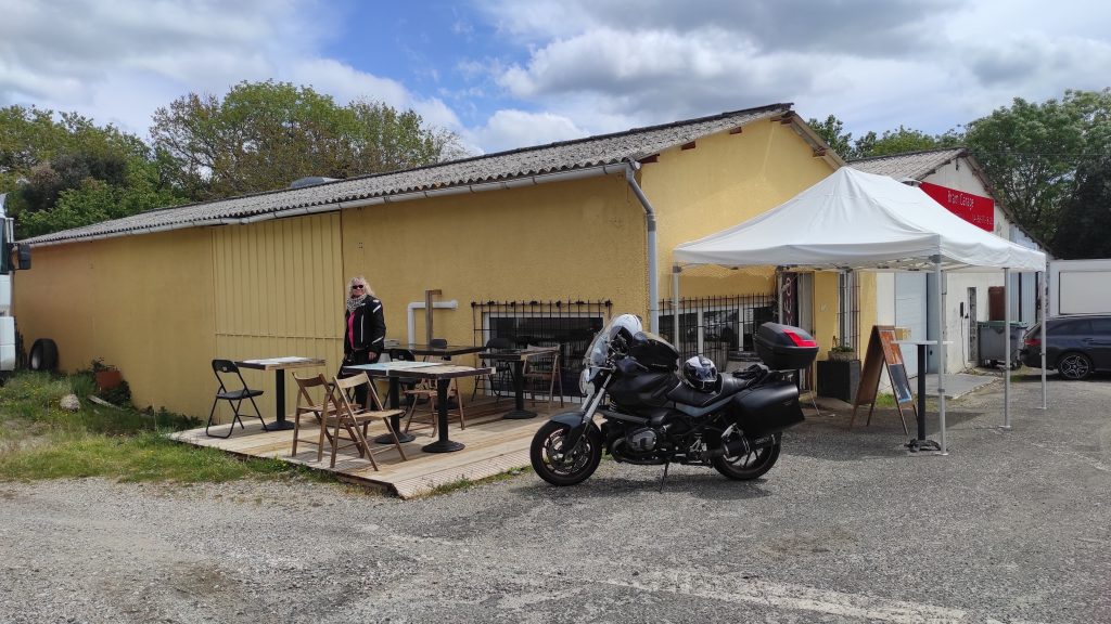 J’ai filmé notre traversée avec la GoPro, je mettrai la vidéo en ligne dès je l’aurai montée. Nous passons ensuite au pied du mythique Pic Bugarach. Au-delà de ses soit-disantes forces telluriques, le pic est imposant et on le voit de loin. La route est jolie avec toujours autant de virages. Nous rejoignons Carcassonne par Limoux puis montons vers Mazamet par la belle D118, route large au bitume parfait et aux multiples virages qu’on enroule en 6ème. Nous nous arrêtons pour déjeuner à un snack en bord de route. Nous comprenons après avoir commandé qu’il n’y a pas de salle et que nous allons déjeuner dehors. Il n’y a pas de vent et le soleil nous réchauffe. De plus la vue est magnifique, on voit même les Pyrénées enneigées au fond !