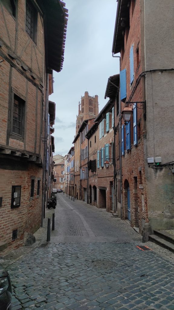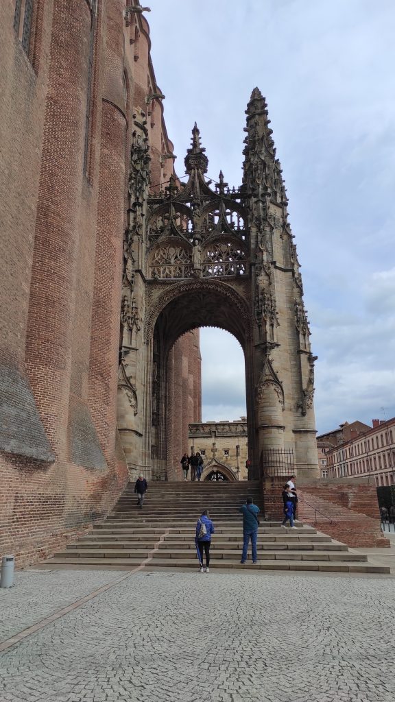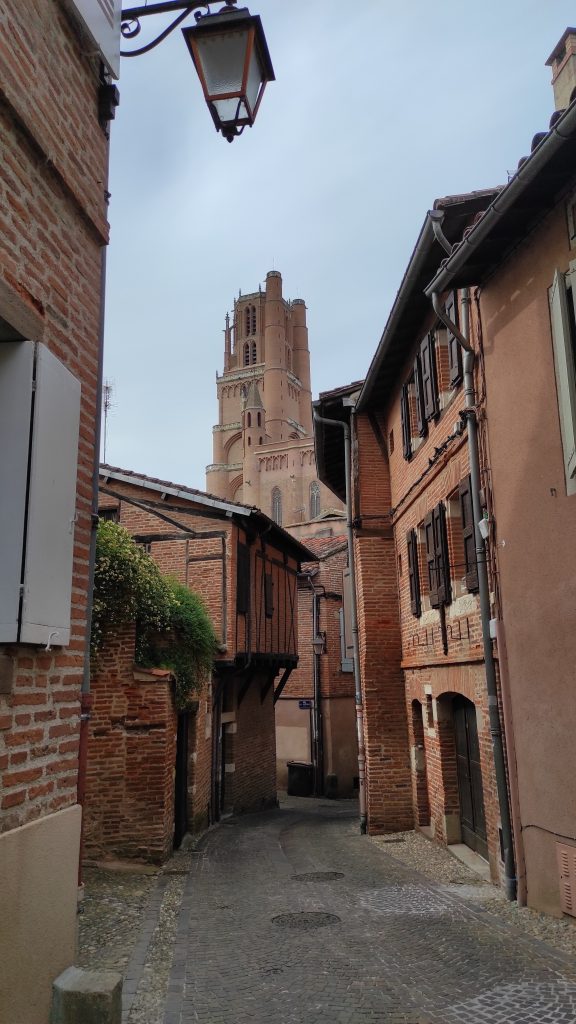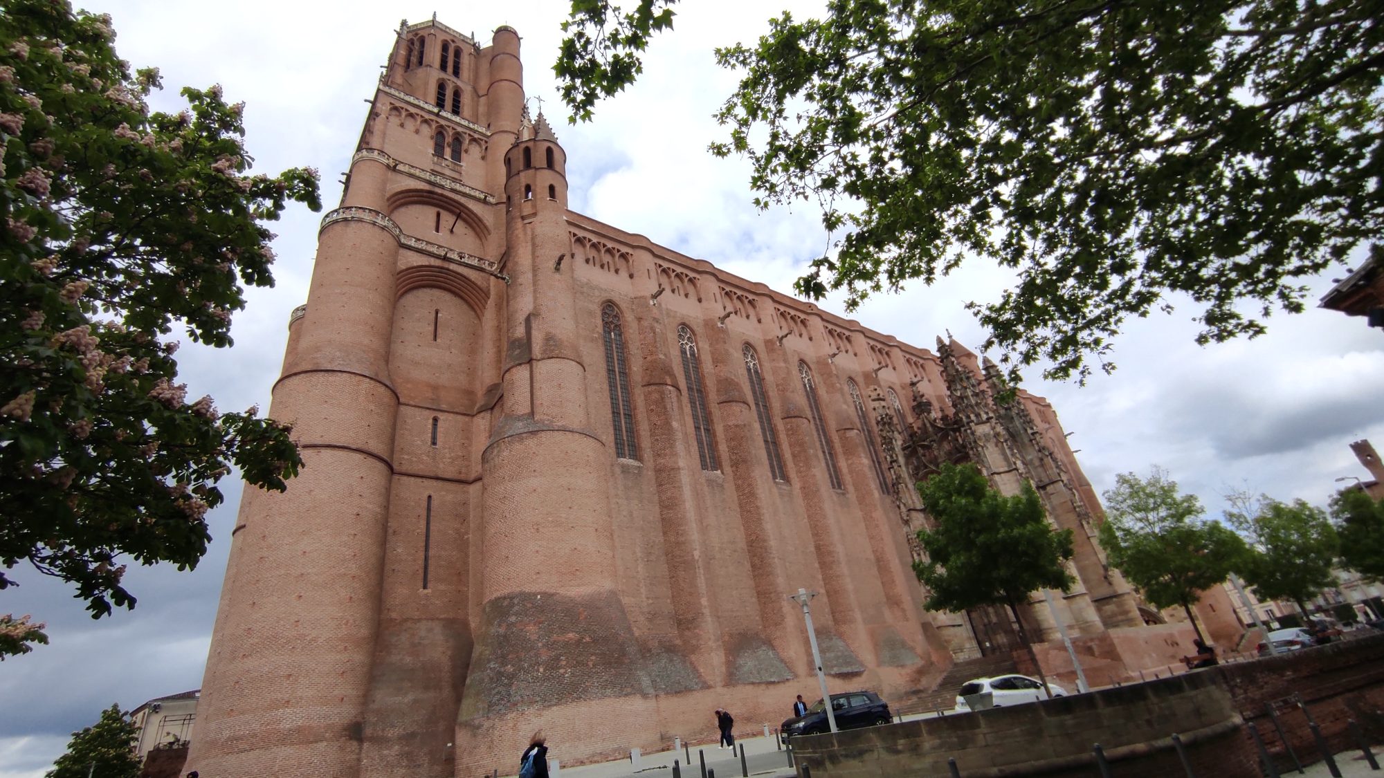 Tomtom nous fait quitter la D118 pour rejoindre la D56 qui traverse la Montagne Noire. Au niveau de Laprade des panneaux bizarres barrent à moitié la chaussée, un panneau rouge disant que la route est interdite et un vert disant que la route est ouverte. Il y a un peu de monde autour et personne ne nous interdit de passer. En avançant nous voyons des personnes s’installer avec des fauteuils au niveau des virages. Je comprends à ce moment-là qu’il doit s’agir du tracé d’une course et je ralentis le rythme et prend les virages aveugles avec précaution, histoire de ne pas me retrouver nez à nez avec une voiture de course en pleine chasse au chrono ! Je suis assez vite rassuré car les gens amassés au bord de la route ne nous font pas signe de nous arrêter et surtout, nous croisons quelques voitures particulières. En cherchant plus tard sur le net, j’apprends que nous sommes sur le tracé du tour auto 2024 dont l’étape du jour va de Limoges à Carcassonne. Nous retrouverons d’ailleurs des badauds dans l’après-midi du côté de Graulhet. En attendant la route tournicote bien jusqu’à Mazamet. Nous rejoignons ensuite Albi en passant par Castres. A Albi, nous stationnons la moto au pied de la majestueuse cathédrale construite en briques.