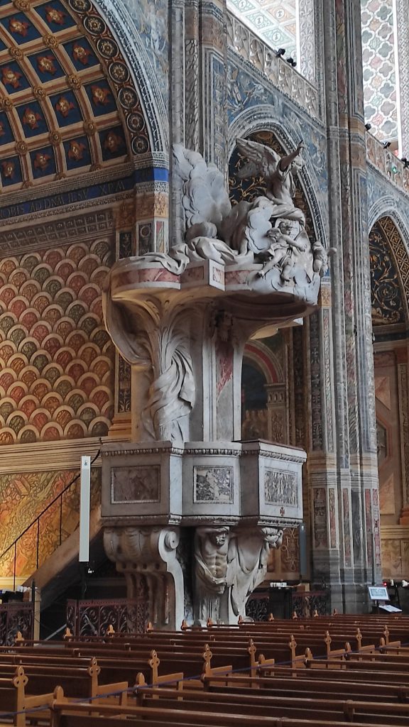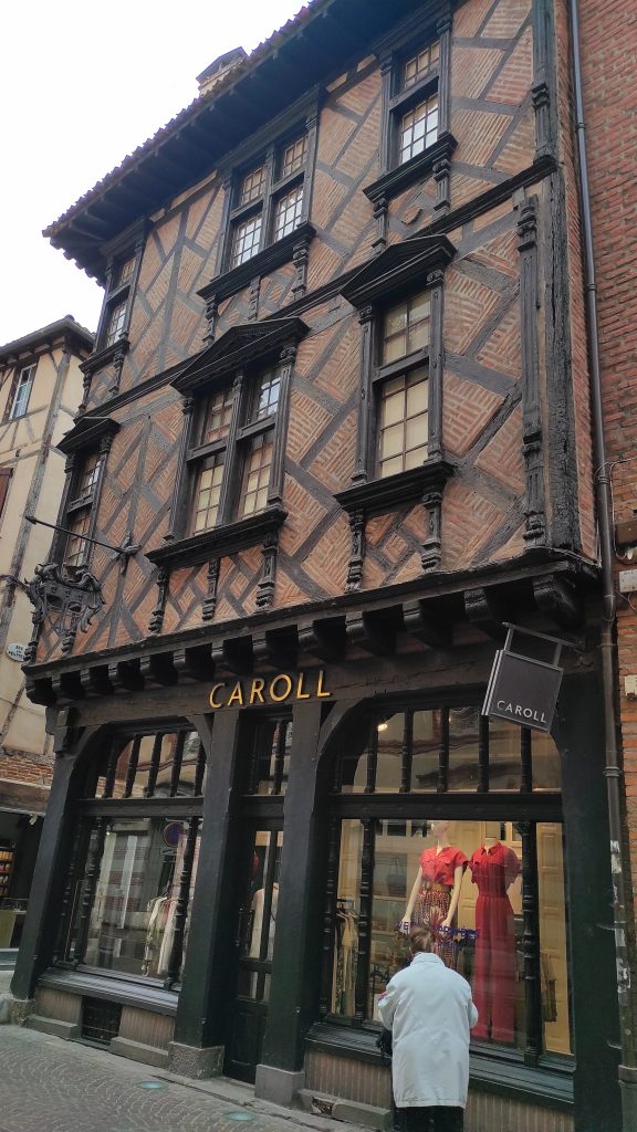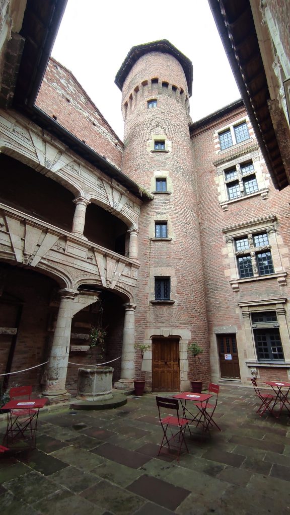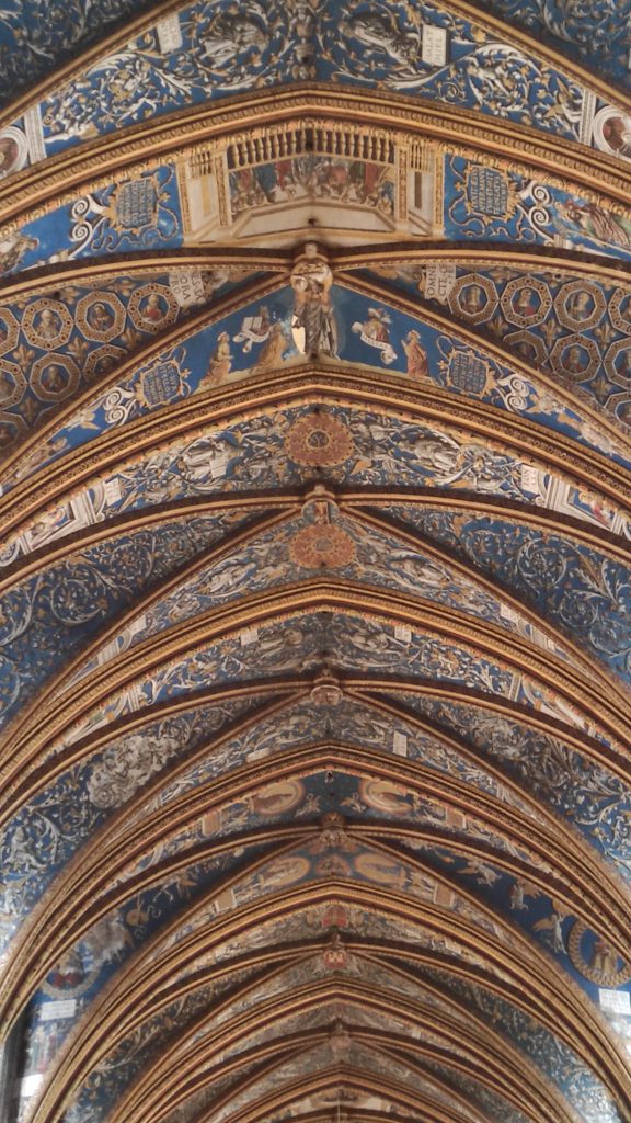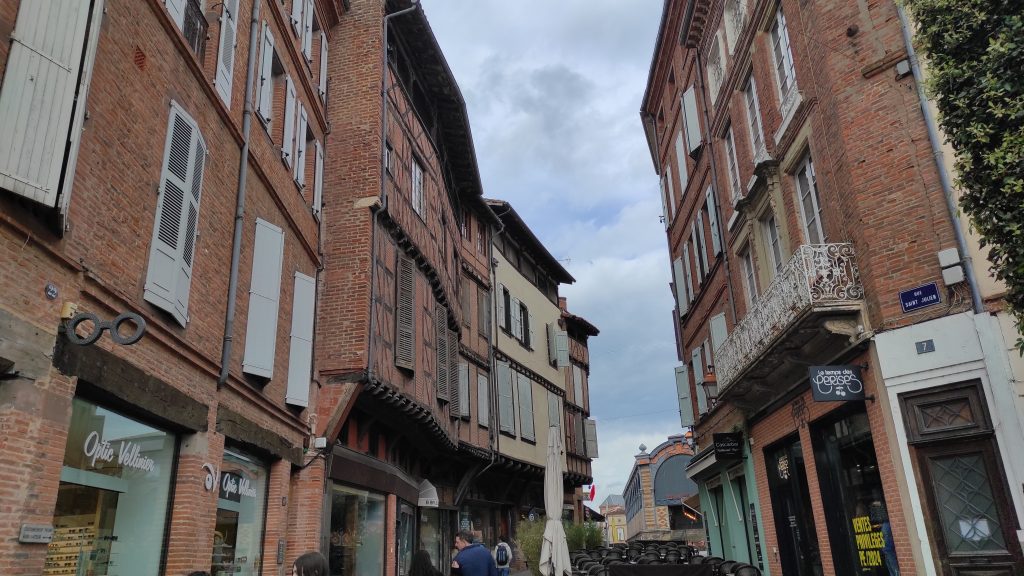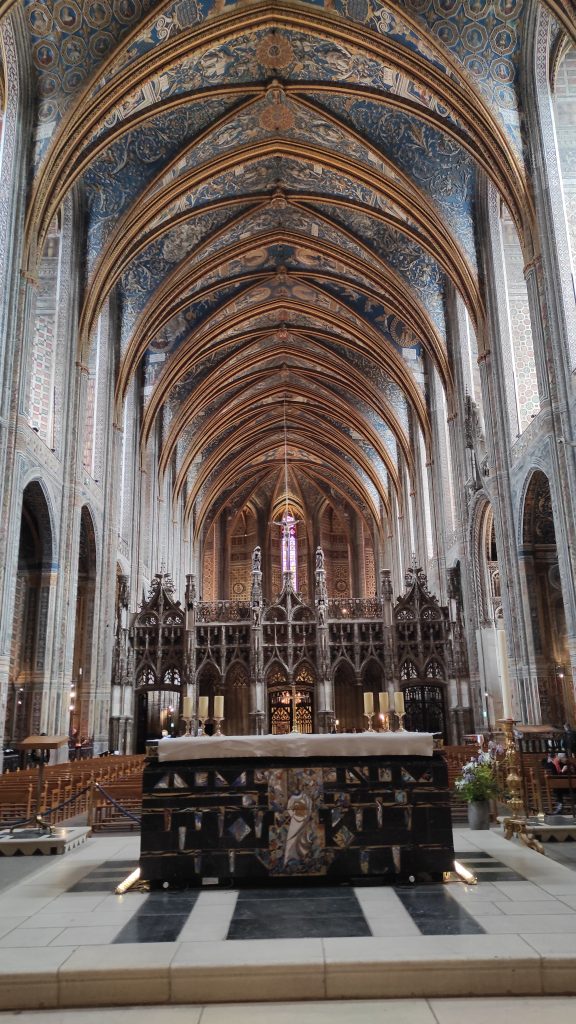 Tomtom nous fait quitter la D118 pour rejoindre la D56 qui traverse la Montagne Noire. Au niveau de Laprade des panneaux bizarres barrent à moitié la chaussée, un panneau rouge disant que la route est interdite et un vert disant que la route est ouverte. Il y a un peu de monde autour et personne ne nous interdit de passer. En avançant nous voyons des personnes s’installer avec des fauteuils au niveau des virages. Je comprends à ce moment-là qu’il doit s’agir du tracé d’une course et je ralentis le rythme et prend les virages aveugles avec précaution, histoire de ne pas me retrouver nez à nez avec une voiture de course en pleine chasse au chrono ! Je suis assez vite rassuré car les gens amassés au bord de la route ne nous font pas signe de nous arrêter et surtout, nous croisons quelques voitures particulières. En cherchant plus tard sur le net, j’apprends que nous sommes sur le tracé du tour auto 2024 dont l’étape du jour va de Limoges à Carcassonne. Nous retrouverons d’ailleurs des badauds dans l’après-midi du côté de Graulhet. En attendant la route tournicote bien jusqu’à Mazamet. Nous rejoignons ensuite Albi en passant par Castres. A Albi, nous stationnons la moto au pied de la majestueuse cathédrale construite en briques.