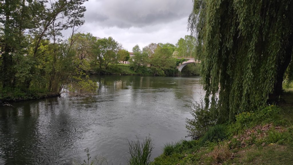Nous reprenons la route vers un hôtel que j’ai réservé sur Booking. Pas cher, il est situé à Bioule, petit village non loin de Montauban. Nous recevons quelques gouttes de pluie de temps en temps mais ce sont de petites averses qui ne mouillent pas suffisamment pour sortir les tenues de pluie. Nous nous installons dans ce petit hôtel simple mais propre puis allons visiter le village.