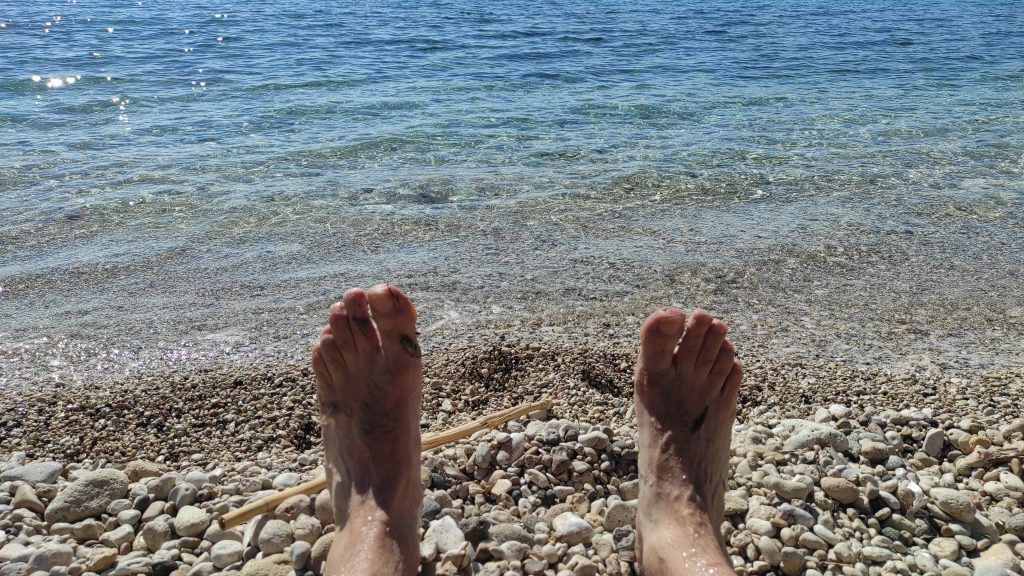 J’atteins enfin la plage après avoir traversé un labyrinthe de petits sentiers entre les roseaux. Il y a à peine une dizaine de personnes par groupes de 2 ou 3. C’est une plage de galets mais l’eau est translucide et sa température agréable. Je m’y plonge avec délectation. Je me repose ensuite sur la plage, le moment est magique !