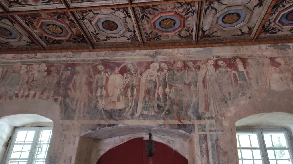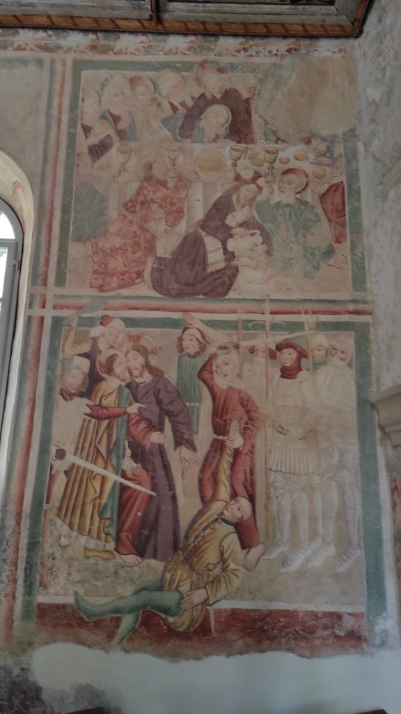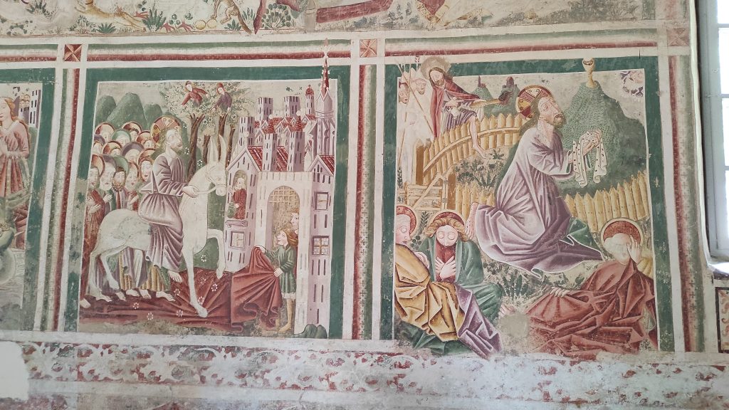 Il y a là un photographe pro qui est chargé de prendre des photos pour réaliser un dépliant publicitaire. Les fresques ont été réalisées en 1474 et conservées plusieurs siècles sous une couche d’enduit. Elles ont été remises au jour en 1987.