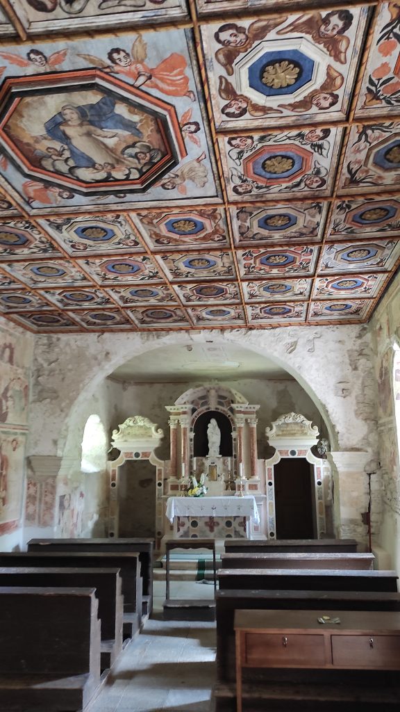 Nous trouvons la dame qui gère les visites et lui demandons le numéro du couple qui vient de les appeler, tout ça dans un mélange d’anglais et d’italien assez approximatifs. Nous les appelons et les guidons jusqu’à l’église minuscule nichée à l’orée d’une forêt.