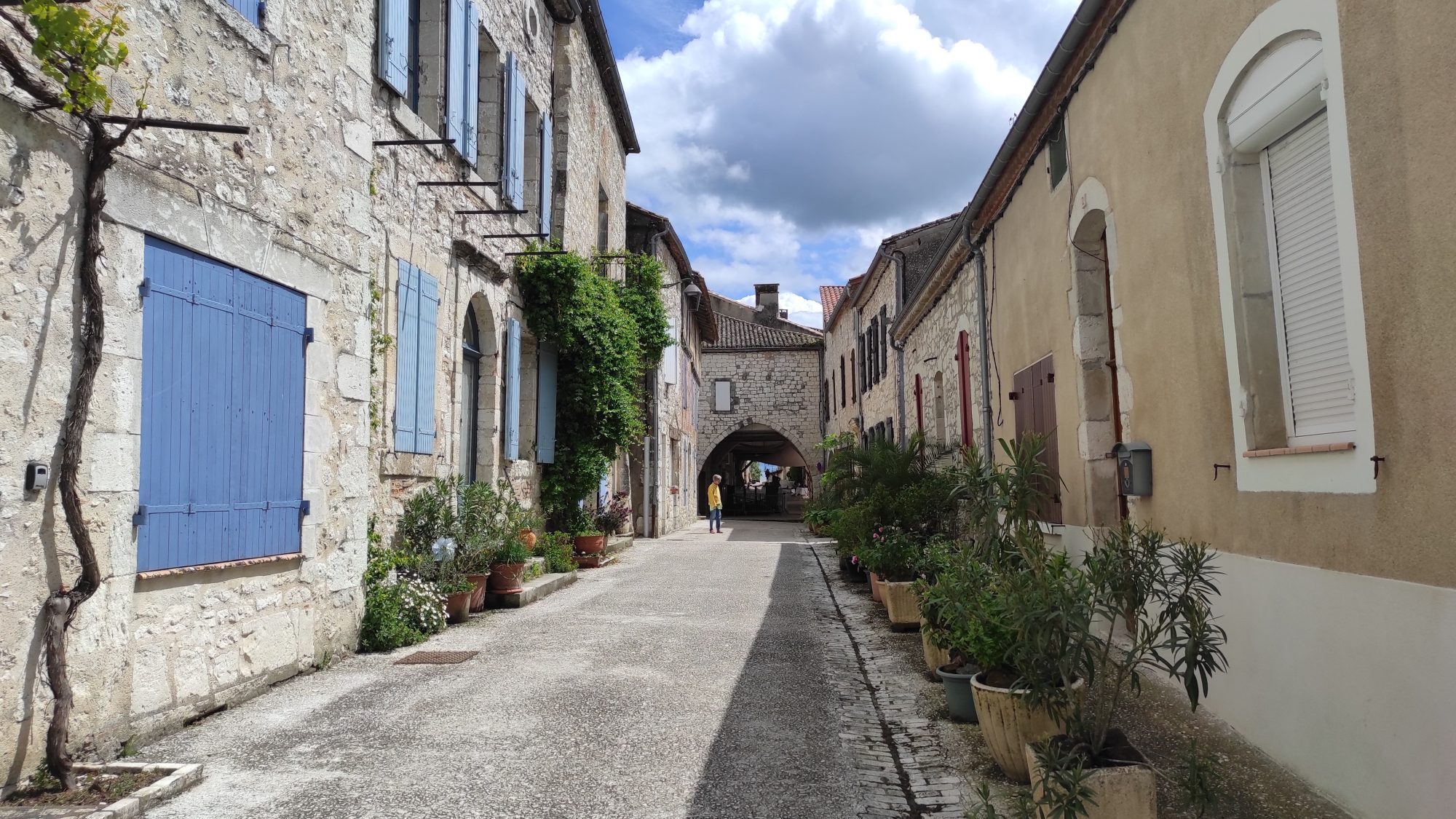 Nous rejoignons Lauzerte en fin de matinée et prenons les routes plus connues par Montaigu (rhaaa la route de Lauzerte à Montaigu !! n’est-ce pas Quentin ?) jusqu’à Fumel où nous faisons le plein. L’heure du déjeuner sonne quand nous sommes en vue de Monflanquin. Nous décidons de monter dans la ville et de déjeuner à la crêperie que nous affectionnons. Heureusement que nous sommes arrivés tôt car la salle se remplit rapidement et certains déjeunent même sur la terrasse. Il est vrai que le ciel est plus clément, il y a quelques éclaircies, peu de vent et le thermomètre flirte avec les 15° !